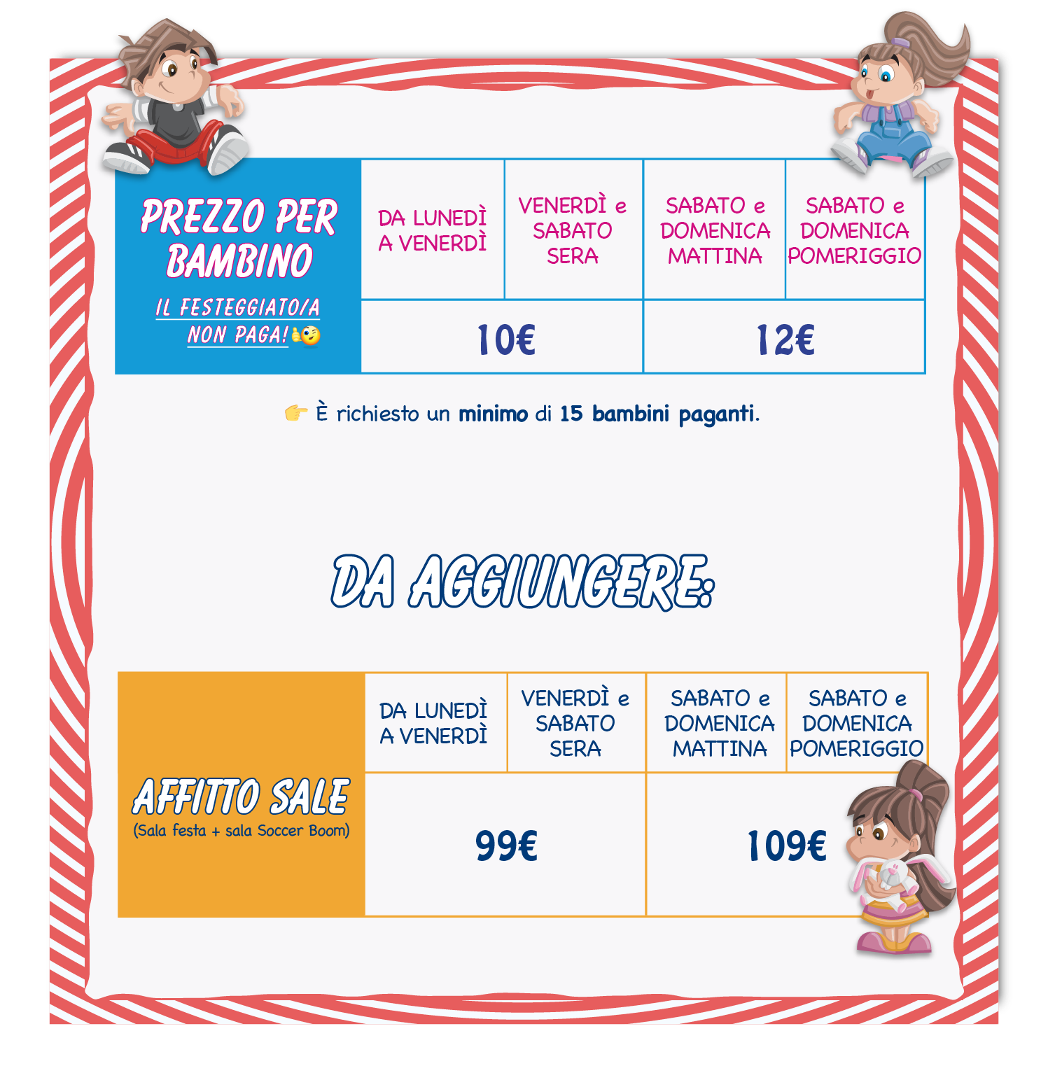 Prezzo per bambino: 10€ x 15 bambini (il festeggiato/a non paga)
